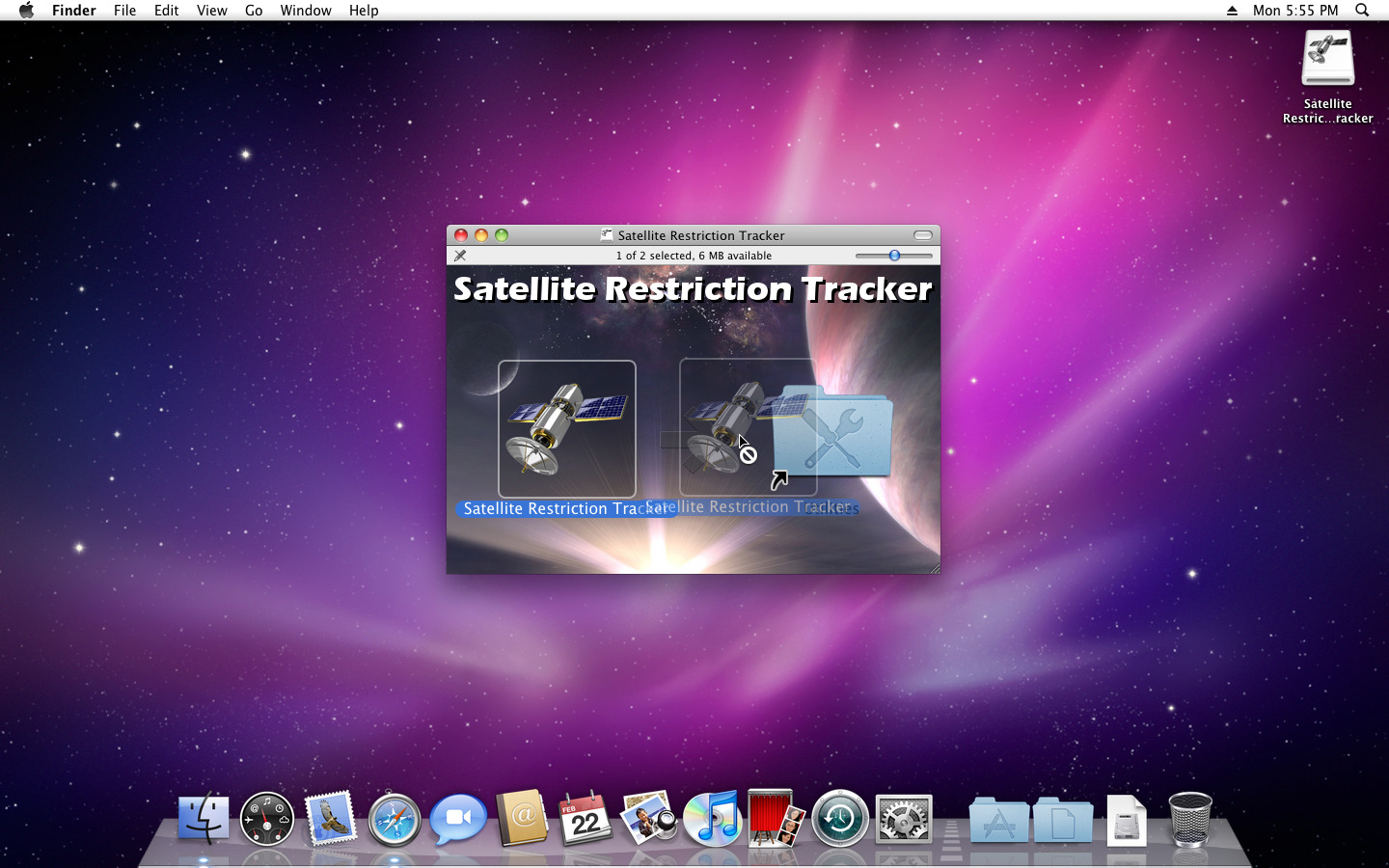 Download and open "SRT_Setup.dmg", then drag "Satellite Restriction Tracker" into the "Utilities" folder. Then eject the SRT installer and delete the SRT DMG file.
