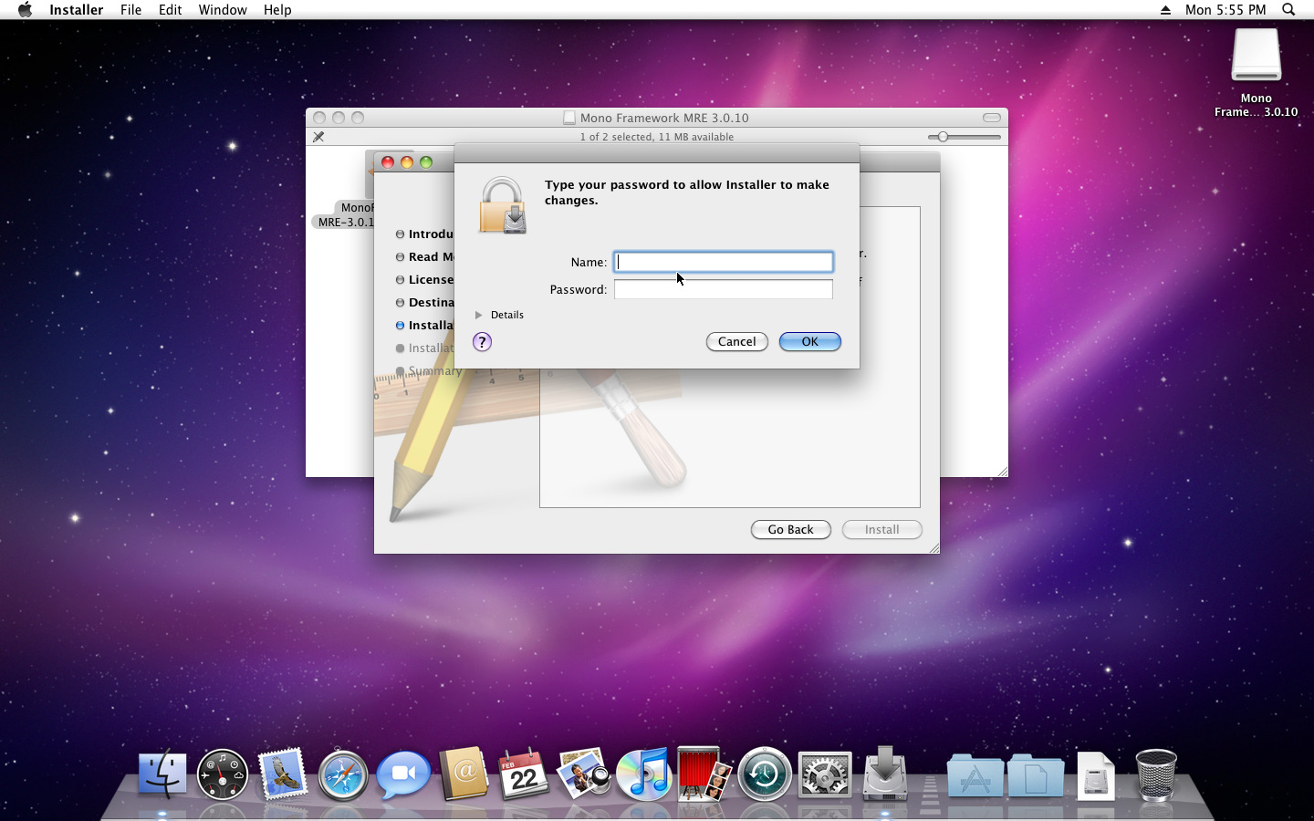 When prompted, enter your Name and Password to allow the installation of Mono.