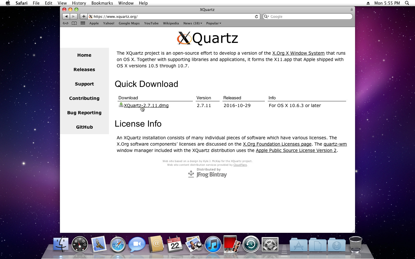 Go to XQuartz.org and click the link to download "XQuartz-2.7.11.dmg". If 2.7.11 is not shown on the home page, go to the Releases page and choose 2.7.11 from the list to find the download link.