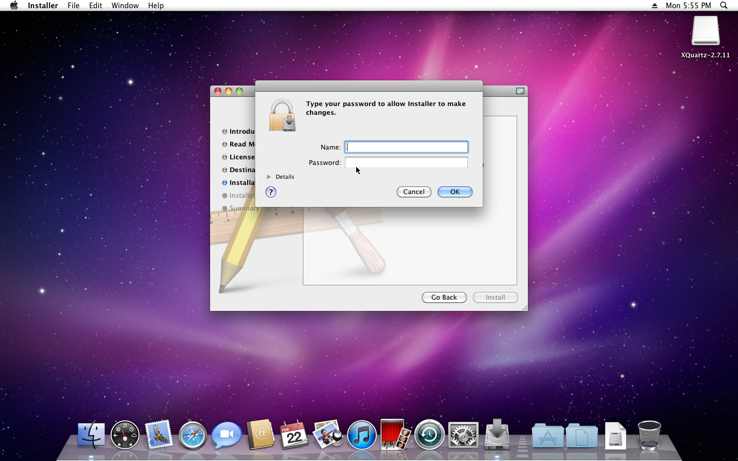 When prompted, enter your Name and Password to allow the installation of XQuartz.