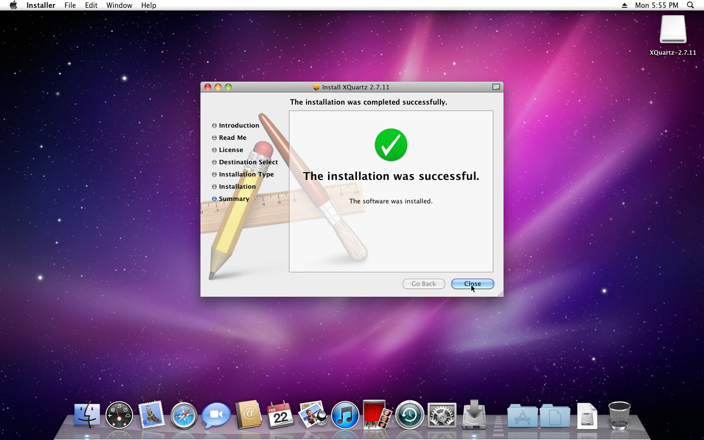 After the installation of XQuartz is complete, click "Close", then eject the XQuartz installer and delete the XQuartz DMG file.
