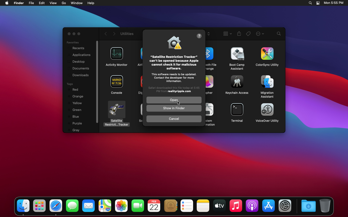 Big Sur will warn you that Satellite Restriction Tracker is not signed by Apple. Click "Show in Finder".