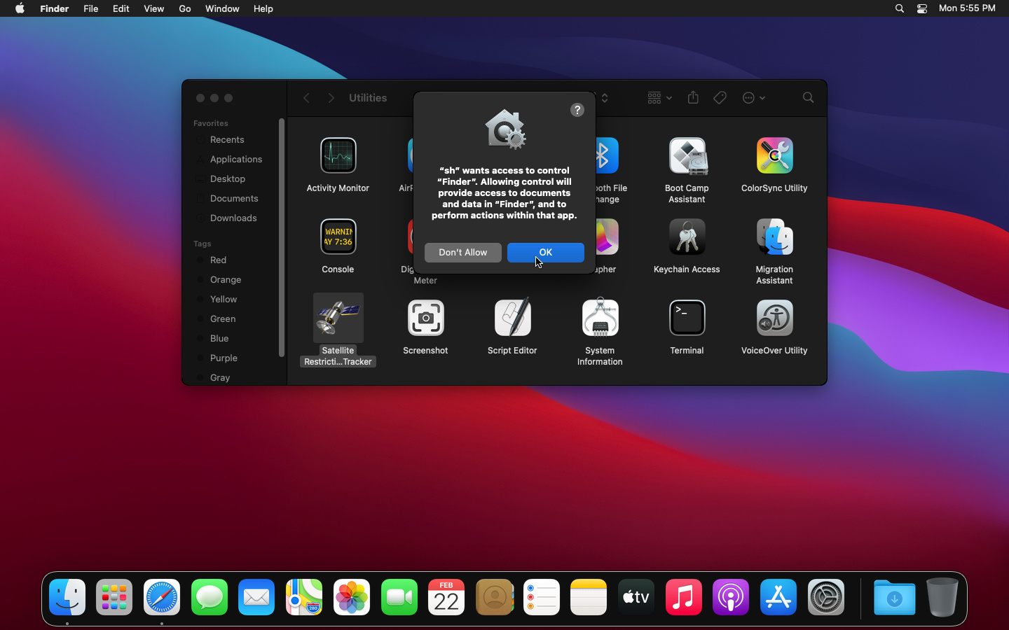 In order to function, Satellite Restriction Tracker requires permission to access "Finder". Please click the "OK" button to allow Satellite Restriction Tracker to run.
