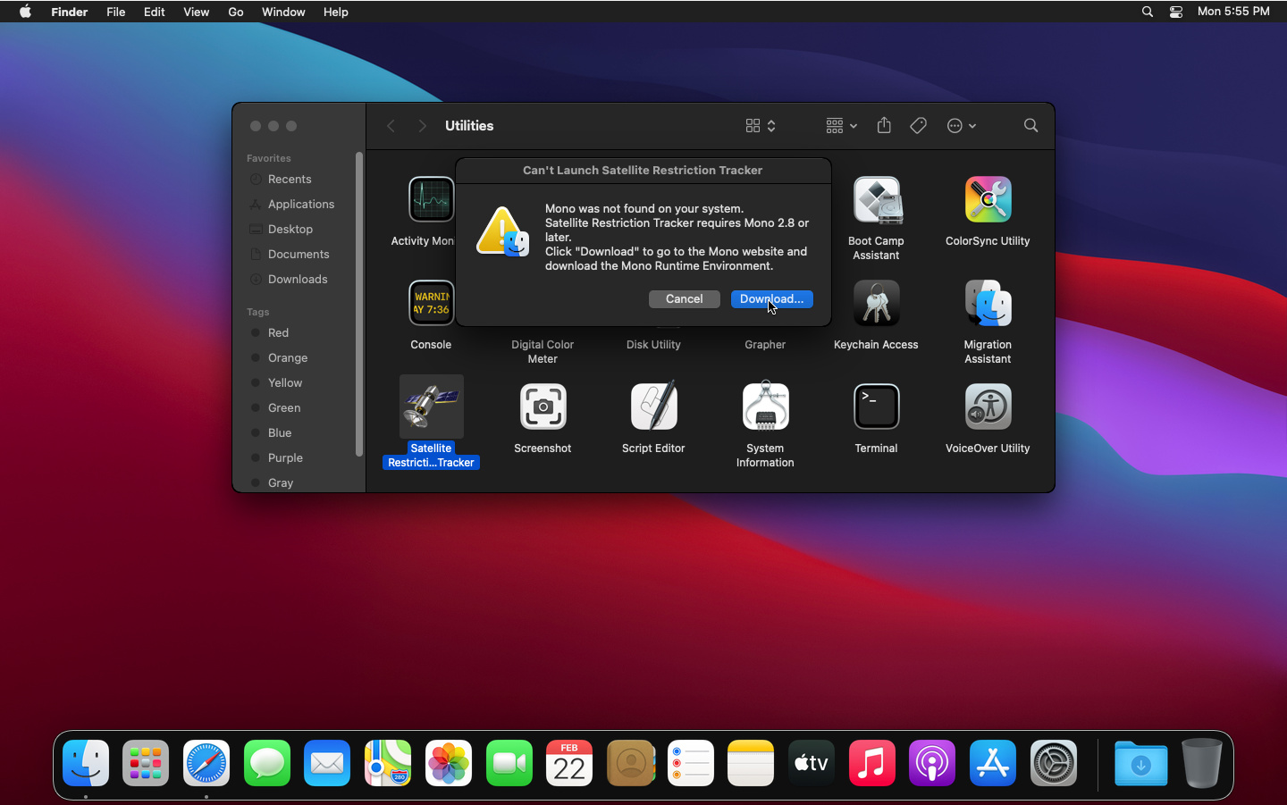 If Mono is not installed, Satellite Restriction Tracker will prompt you to download Mono. Click "Download..." to begin the download.