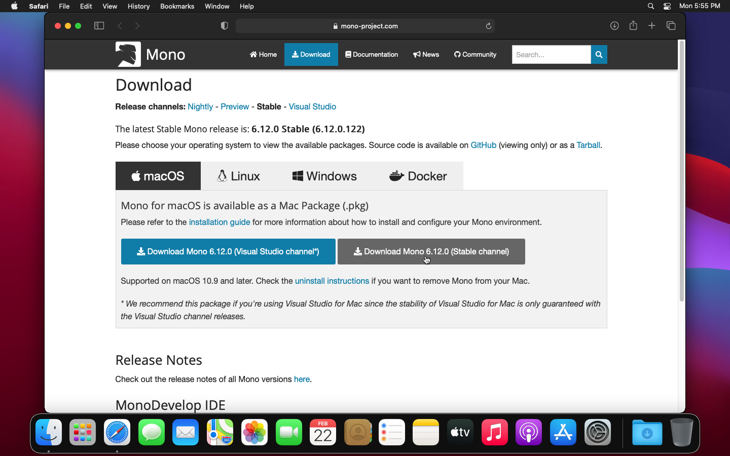 Make sure macOS is selected and click the "Download Mono" button to begin downloading the Mono framework. Either the Visual Studio channel or the Stable channel will work.