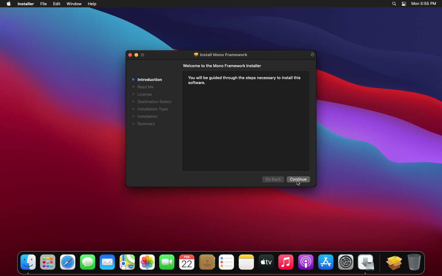 When the Mono framework PKG has finished downloading, run the package and follow the instructions on the screen to install Mono on Big Sur.