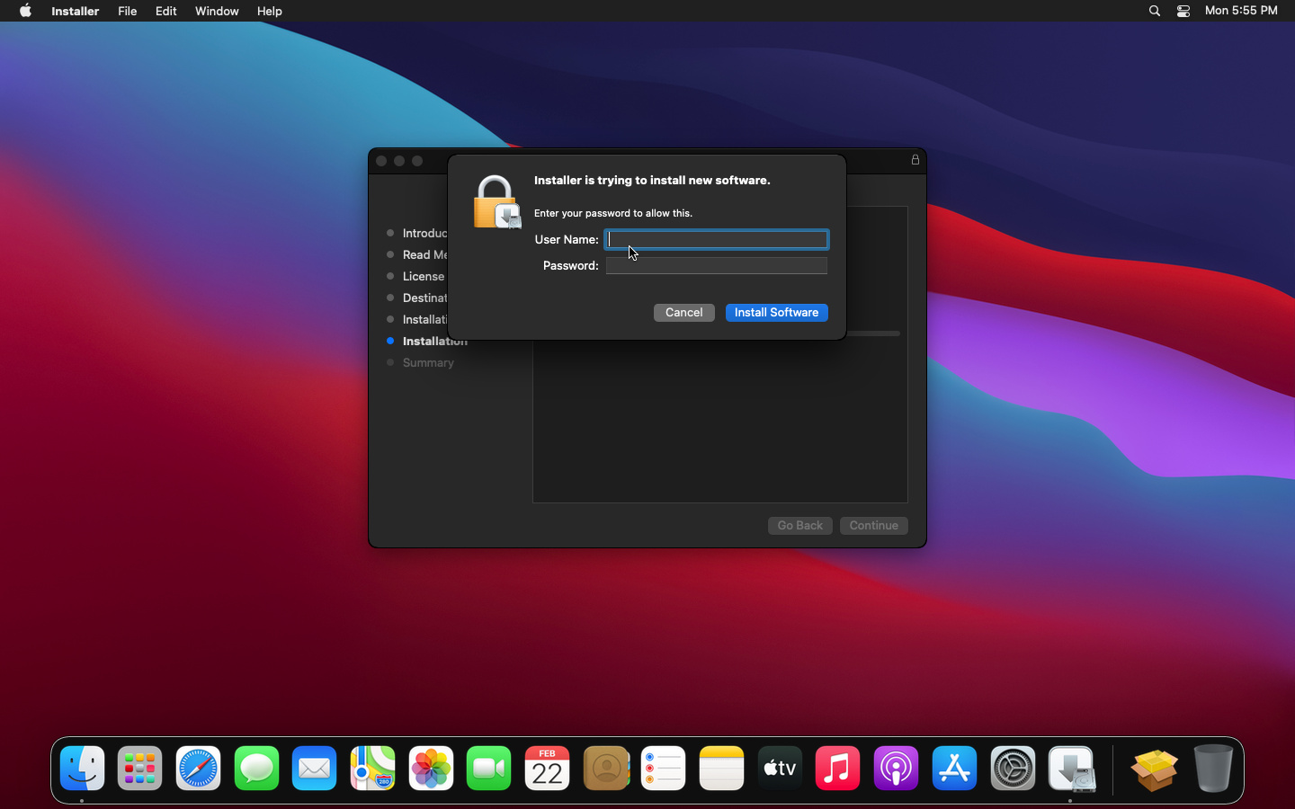When prompted, enter your Name and Password to allow the installation of Mono.