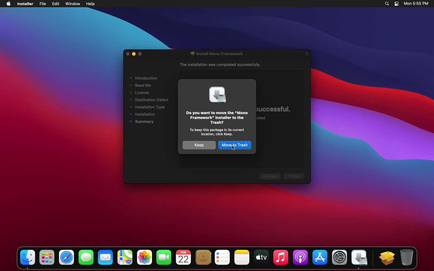 After the installation of Mono is complete, click "Close", then "Move to Trash" to delete the Mono PKG file.